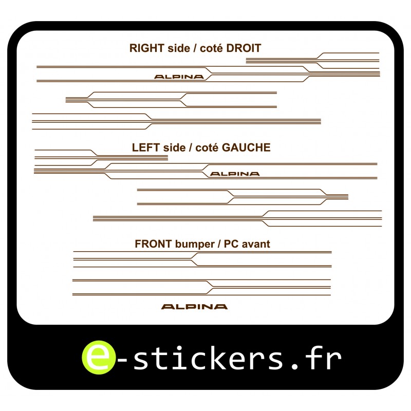ALPINA E24 stripes "DEKO SET", complete decal set, front bumper, sides, with alpina logo, choice of colors, gold, métallic grey , as originals
